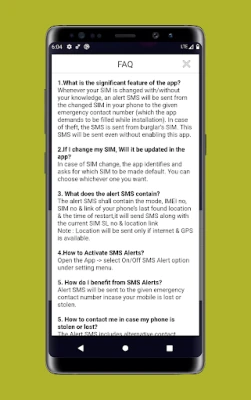 Whenever your SIM is changed with/without your knowledge, an alert will be sent from the changed SIM in your phone to the given emergency contact number (which the app demands to be filled while installation). In case of theft, the is sent from burglar’s SIM. This is sent even without enabling this app.