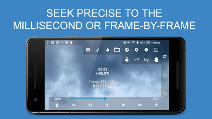 Ad-free video player for android with rare features not found in most popular players. Focuses on precise control of the playback such as volume level, video seek, etc.